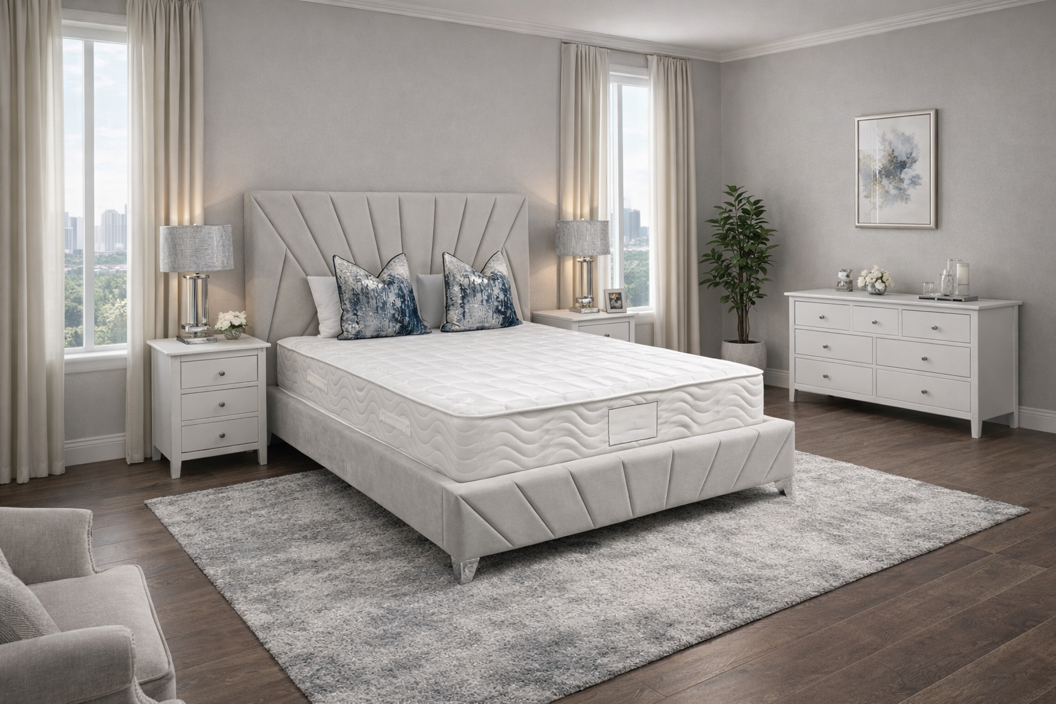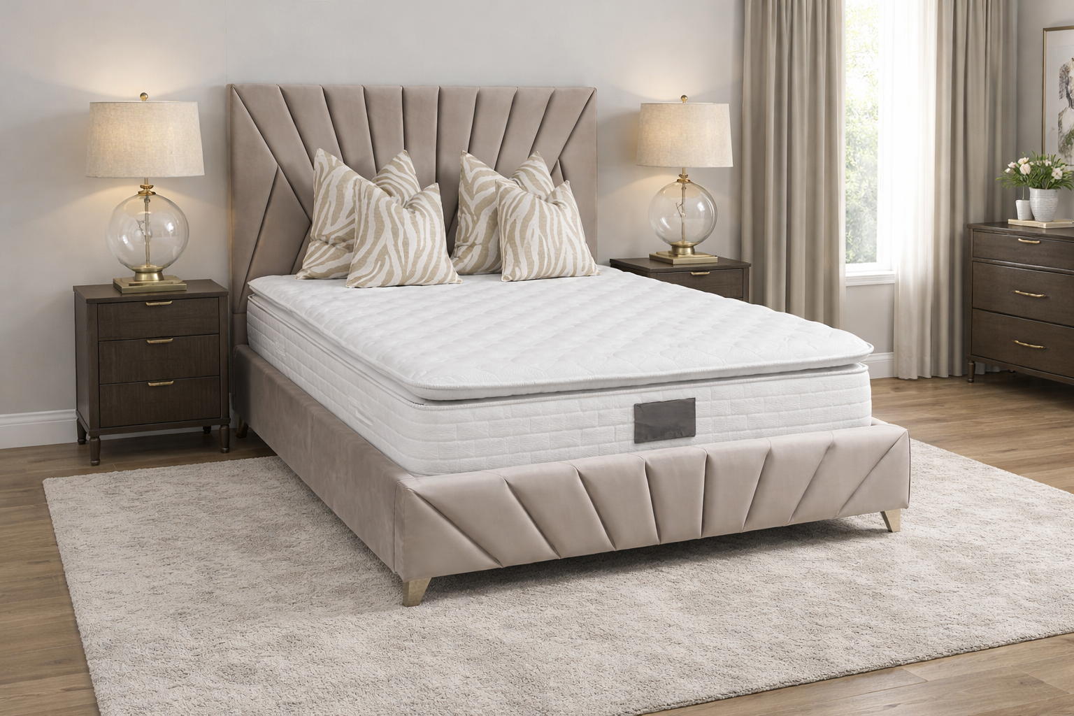 The Cambridge bed features a modern upholstered design. With a tall headboard padded with a distinctive geometric fan-like channel pattern that adds texture and visual interest. The footboard mirrors the headboard design at a lower height, giving the bed a cohesive, elegant look.
